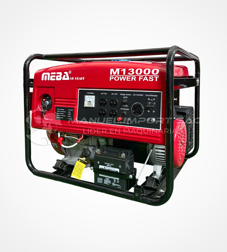 Generador Meba 13000W Gasolinero Monofásico Motor 18HP, ofrece una potencia de 8kW, tiene una funcion de fácil de usar y poder movilizarlo en lugares donde se requiera, ideal para usos domesticos y para alimentar pequeñas máquinarias de construcción, agricultura, etc.